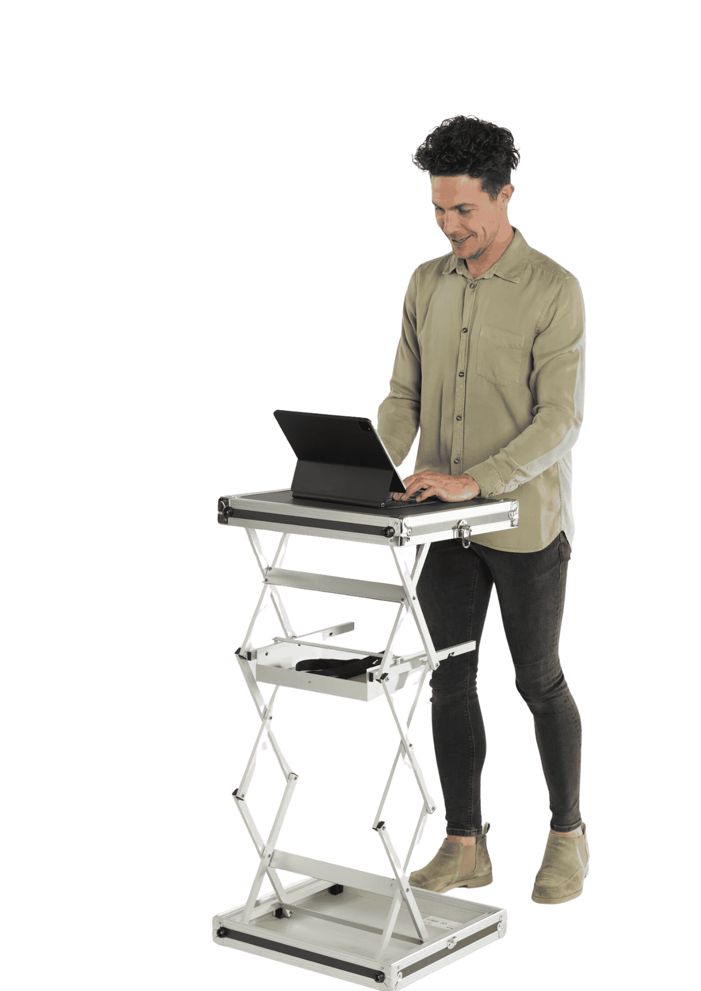 Fabriqué en aluminium T6 léger de haute qualité, le Quiffice est idéal pour un usage quotidien. Il peut accueillir un ordinateur portable jusqu'à 17 pouces et est réglable en hauteur (76 cm et 102 cm). Il s'adapte ainsi à toutes vos activités, où que vous soyez, quand vous le souhaitez.