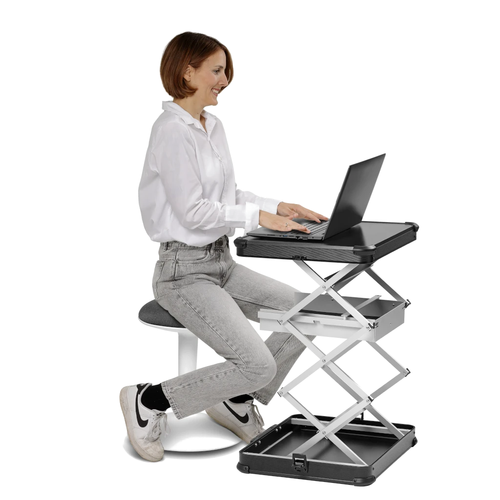Grâce à la Quiffice Pro (QK120), fini les solutions de fortune comme des tables, des boîtes et des étagères. Emportez une seule valise, dépliez-la et mettez-vous au travail. Compacte et robuste, elle est fabriquée en aluminium léger et en stratifié haute pression (HPL) résistant aux rayures. Avec Quiffice, travaillez où et quand vous le souhaitez.